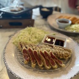 4.5/5 - I really liked this place! Parking was a little difficult (they have a lot around the back, as well as a metered parking lot across the alley, but not a lot of street parking). As soon as we walked into the restaurant, however, we were seated immediately - which was a little surprising considering it was peak dinnertime on a Saturday night. Service was fine - food came out fast, but we had to flag down the waiter to refill water. Interestingly, they gave us smaller water cups than the other tables but we didn't mind. There seemed to be a language barrier when ordering however, and the waiter didn't really understand my English. We got the Hamburg with Egg and Cheese, the Sweet Potato Cheese katsu, and the Tuna Tataki. The Hamburg was SO GOOD!! I loved that we could cook it to our liking, and their sauces were flavorful. The Katsu was alright; the meat was pretty thin and they didn't give me any cheese... but I'm going to say it was just miscommunication. The Tuna Tataki was also good, but nothing noteworthy. Overall, I'd come back for the Hamburg (and maybe to try the Ribeye)!